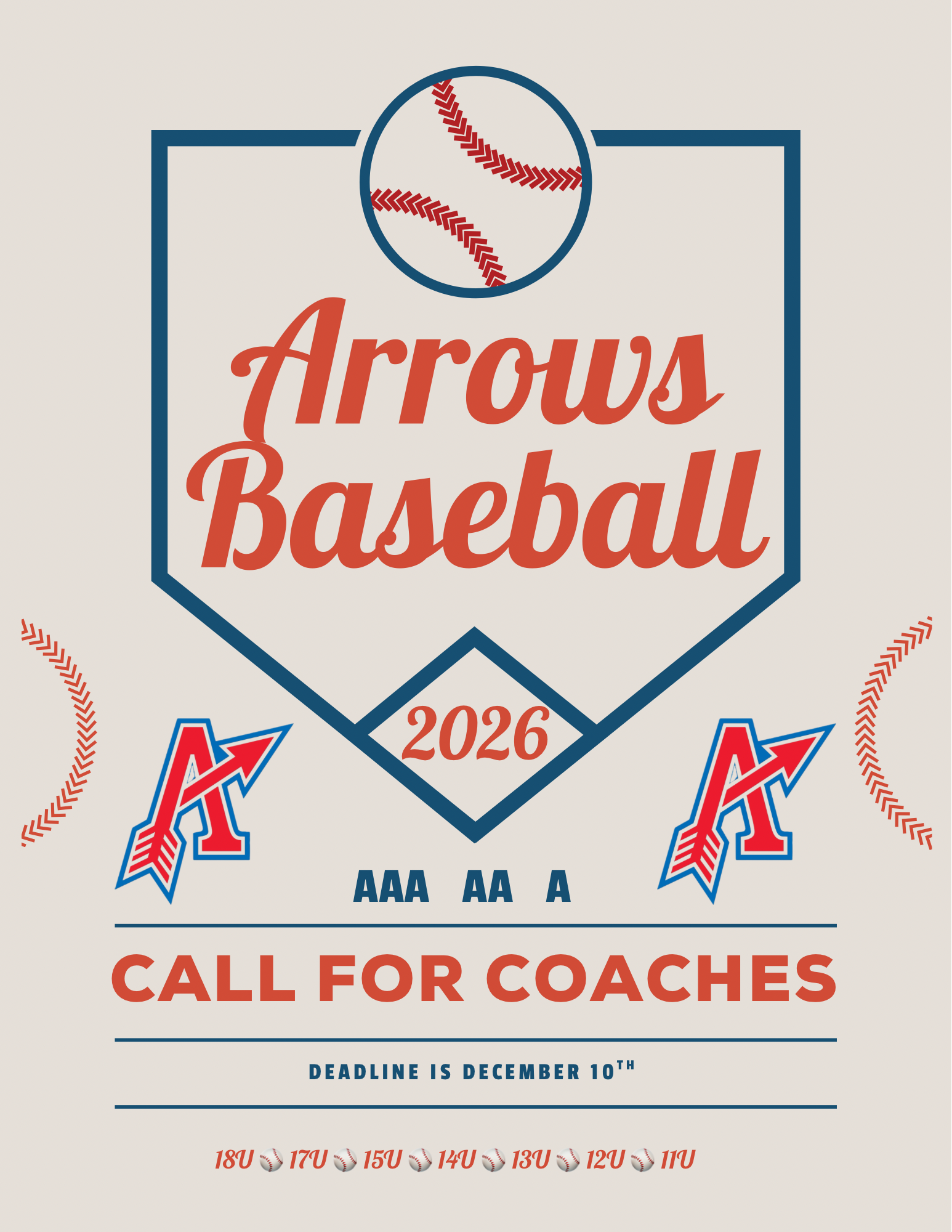 Arrows Baseball is seeking coaches to lead our teams for the 2026 season. In addition to our lineup of highly competitive co-ed teams, the Arrows will be adding all female teams to our program in 2026 as well. If interested in coaching any of our teams, please fill out the form in the attached link.